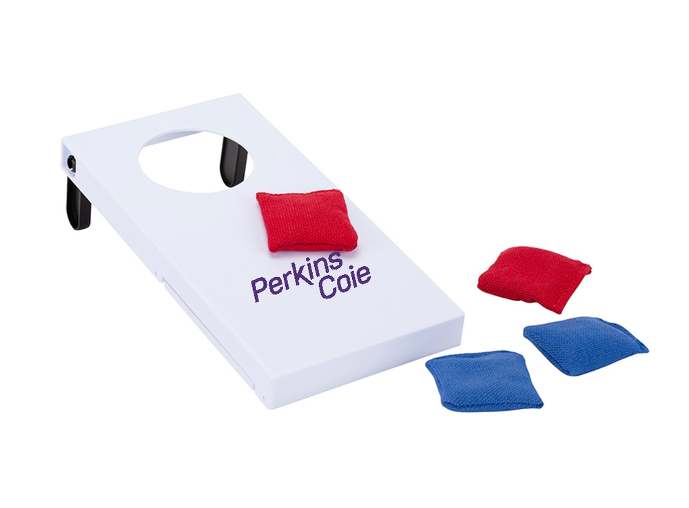 sku: PER-MERCH-2035Take a break with this Tabletop Cornhole Game Set and test your skills! Set it up at home on a table or counter, or throw it in your bag for entertainment on-the-go to keep friends and family entertained. Or, take this set to the office and set it up on the conference or breakroom table and start a tournament. The set includes one board with folding stands and four mini canvas bean bags (2 blue, 2 red). While not in use, the bean bags can be conveniently stored in the storage compartment under the game board.